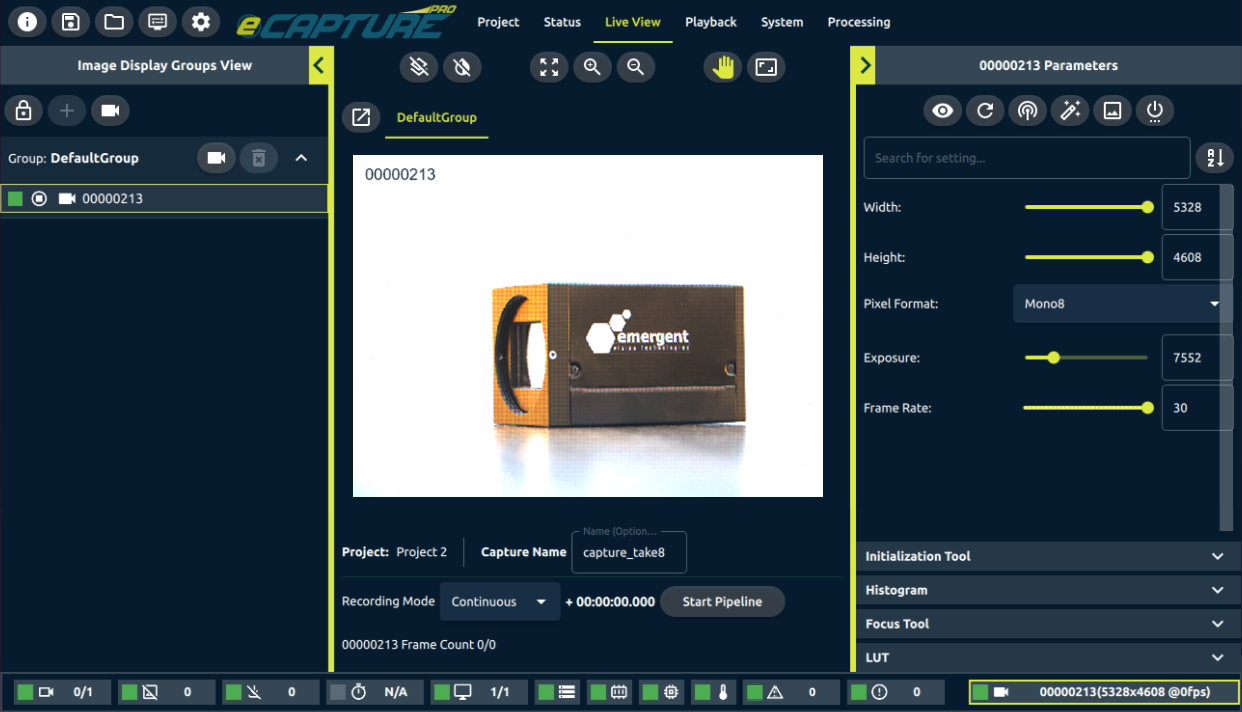 After installing eCapture Pro, validate that you can use it to connect to an Emergent Vision camera and view streaming images.