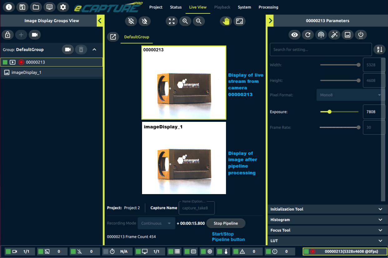 Figure 6: Images before and after pipeline processing displayed on the Live View tab in eCapture Pro
